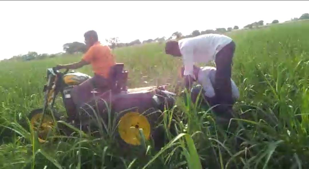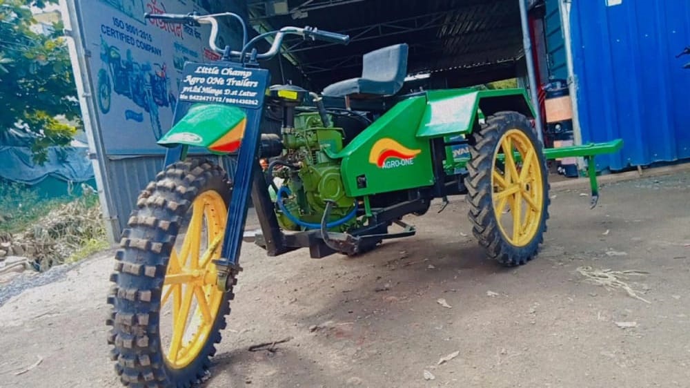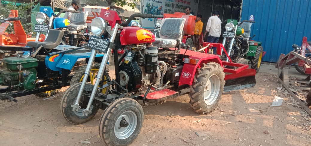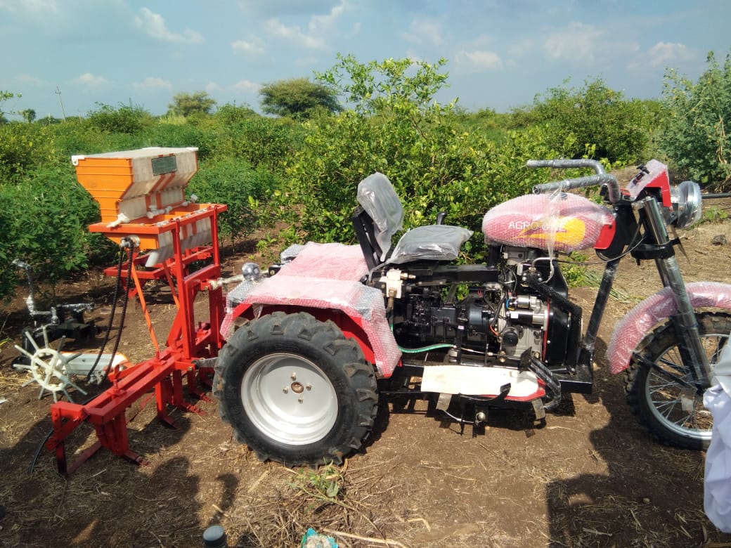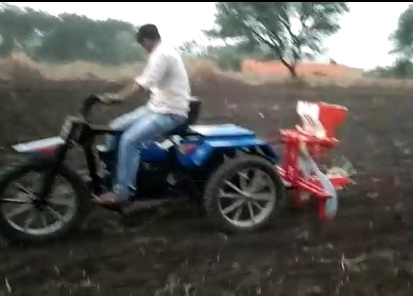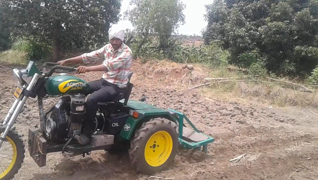 Magbul Chandsab Shaikh's native Murambi house in Chachur taluka was in dire straits where his elder brother Mansurbhai Shaikh was working as a tractor repairer at Nilanga, with whom Magbul Shaikh learned tractor repair. With twenty years of experience, Magbul Shaikh created a 10hp three-wheeled Bullet-like tractor, keeping in mind the challenges faced by the farmer. The tractor can easily work in four feet rain. This tractor mounted implements are Tiri, V-Pali, Straight-Pali, Planter, Sprayer, Dumping Trailer, Rotavator, Soybean, Chana, Udid, Moong, Wheat, Dhan and other crops are harvested and heaped at a distance of 20 feet. runs on This technology can be used in an easy way, which is not available in any cutter so far. Especially with the help of this tractor this tractor can do the grazing which has become a serious problem for the farmers nowadays. A small powerwidder is also made in 5hp for another colpani.